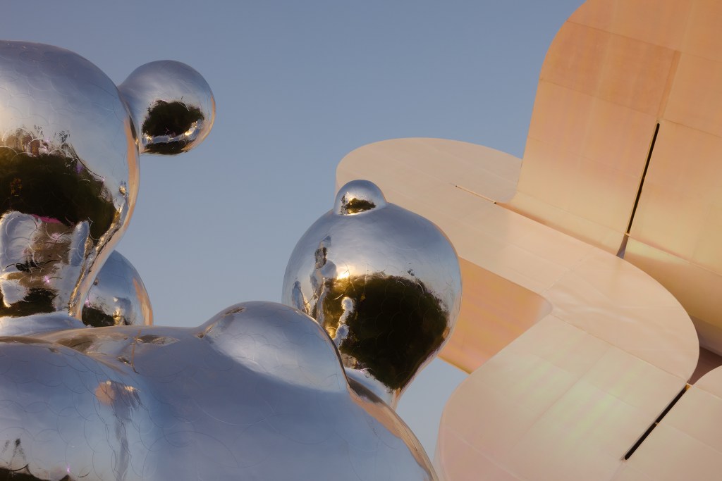 Constructed out of steel and wood with a vinyl color-gradient surface, Özel’s 60-foot-tall “Holoflux” marries sculpture with architecture. From afar, the three-legged piece appears as a series of spherical forms, different from every angle. Up close, it’s possible to walk through and lay underneath, which alters how viewers interact with the it. At night, “Holoflux” disappears in a way, as real-time projections, graphics and flickering lights that change color create a different narrative. Altogether, Özel’s intention was to merge cyberspace with a physical environment.