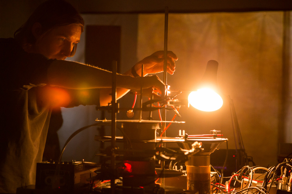 Multiple layers of modified records rotate on the turntable. Some of the vinyl has been sliced and bent, while others have little nuts and bolts drilled in or are covered in stickers to blank out certain sections. A ring standnormally used to clamp test tubes in laboratoriesholds a few contact mics. The tonearm is precariously held in place, tethered by a string leash. With every revolution, analog synths and drum machines are triggered. A beat even gets tapped out on a cowbell, without any human touch. This is Mechanical Techno.