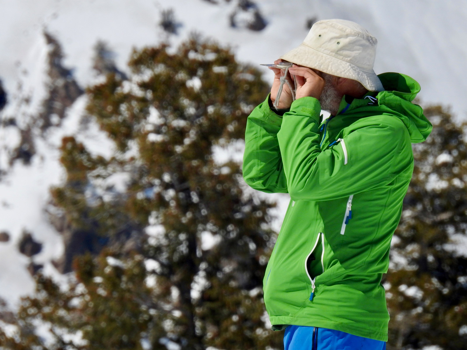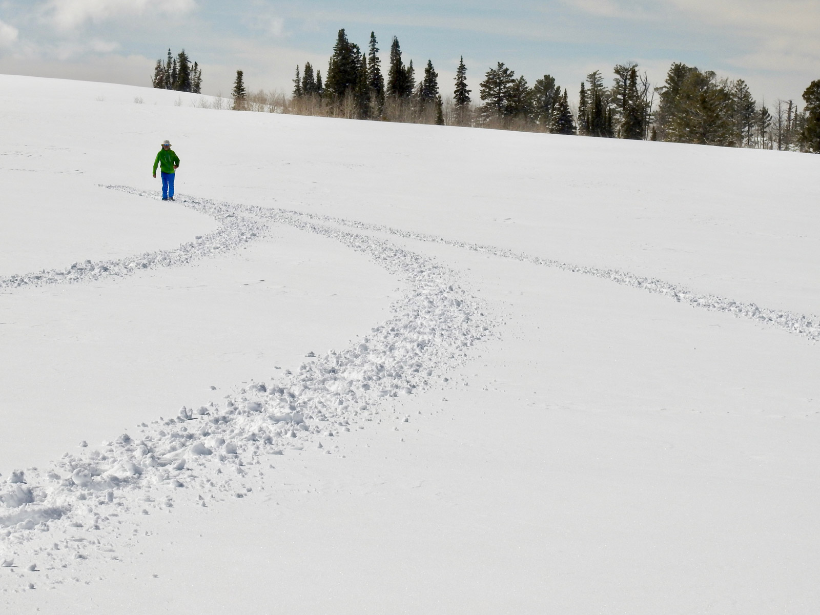 This year the visit was delayed as I shuffled my schedule around to accommodate a postponement. The occasional crowds of local helpers and large snow fields is perhaps the key attraction of the Summit artist-in-residence program each year, but many times people underestimate the amount of time and dedication required to complete a mural. It is often the case that helpers and assistants can only endure a few hours snowshoeing and then head back to the lodge. So now my approach is to put the main framework of each drawing and then add to the drawing with the assistance from available volunteers in a manner that keeps it symmetrical.