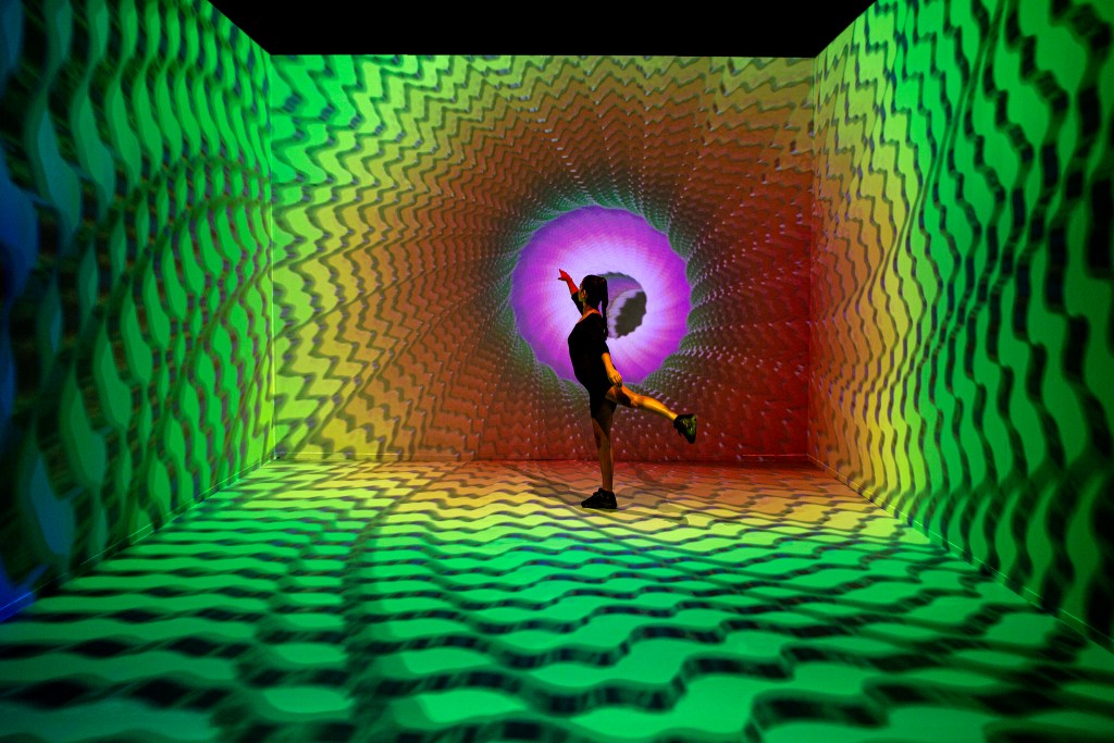 The best way to understand Stark’s tantalizing geometries is to experience it for oneself. However, a general awareness of what unfolds makes the immersion even better. For instance, the first room, referred to “Space Junk,” is where icons move toward and stick to participants. Thanks to high-end motion sensor technology, they’ll even follow a person up a wall (to a certain extent). A wind chime sound effect accompanies the magnetic visuals.