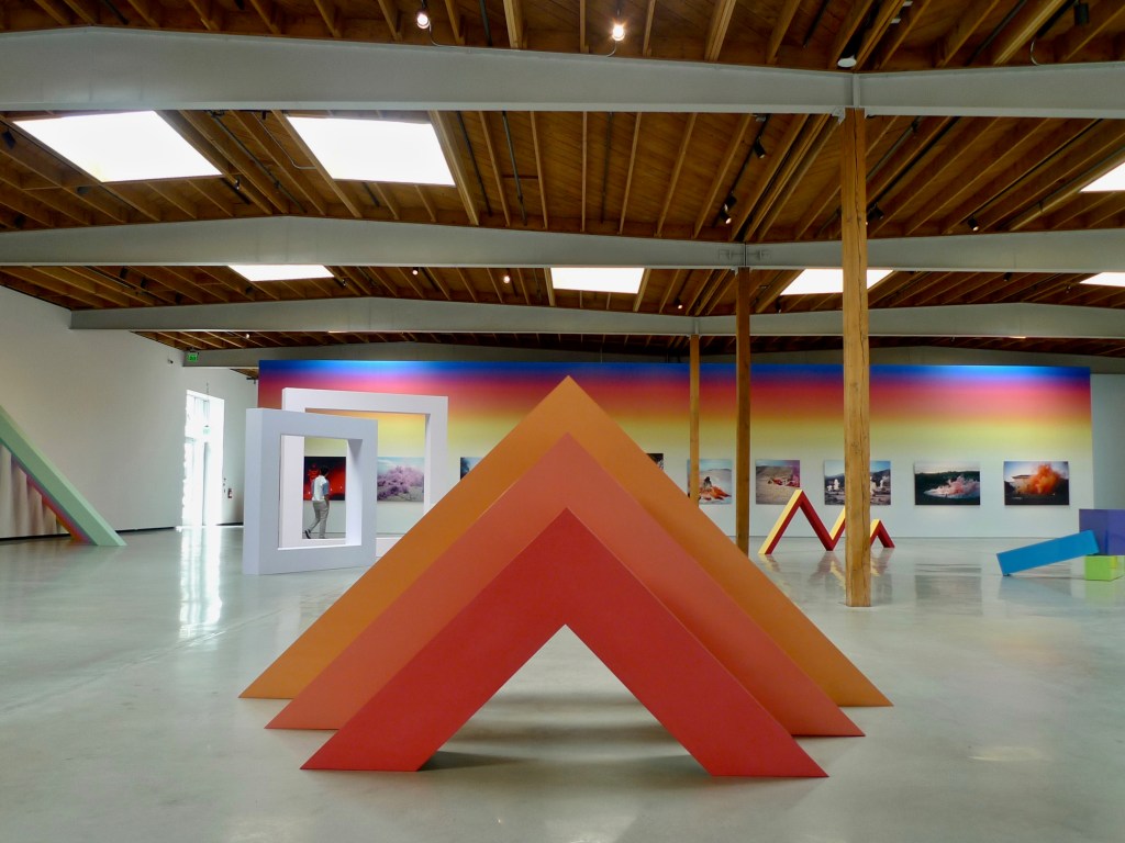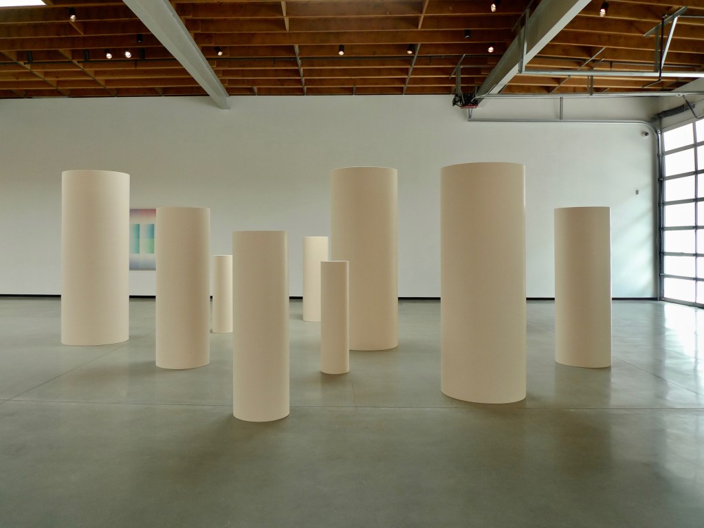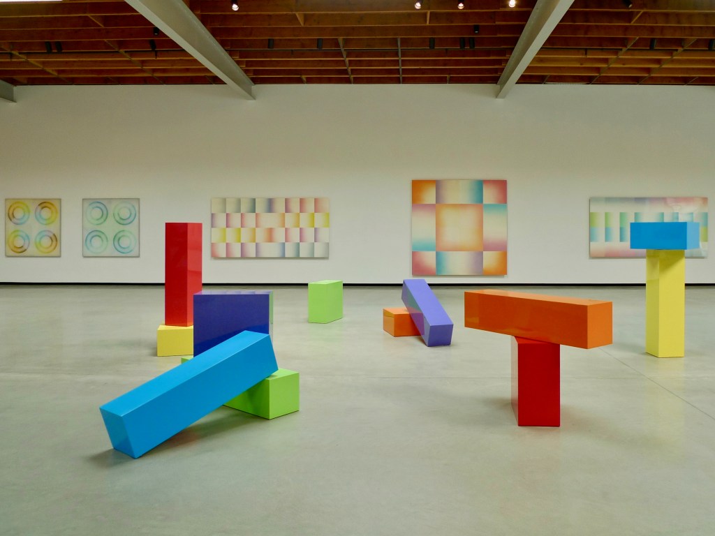 The exhibit places examples of several of Chicago’s series side by side. Three panels of “Pasadena Lifesavers” hang near “Rearrangeable Rainbow Blocks,” while various “Iridescent Domes” sit on tables near the wall where her “Car Hoods” sculptures hang. “10 Part Cylinders” anchors the North East section of the gallery, and opposite “Rainbow Pickett” leans against the wall. Major sculptural works “Trinity” and “Zig Zag” sit in the middle of the light-filled space, allowing viewers to observe them from every angle. Archival prints from her “Women” and “Smoke” series flank the length of the back wall.