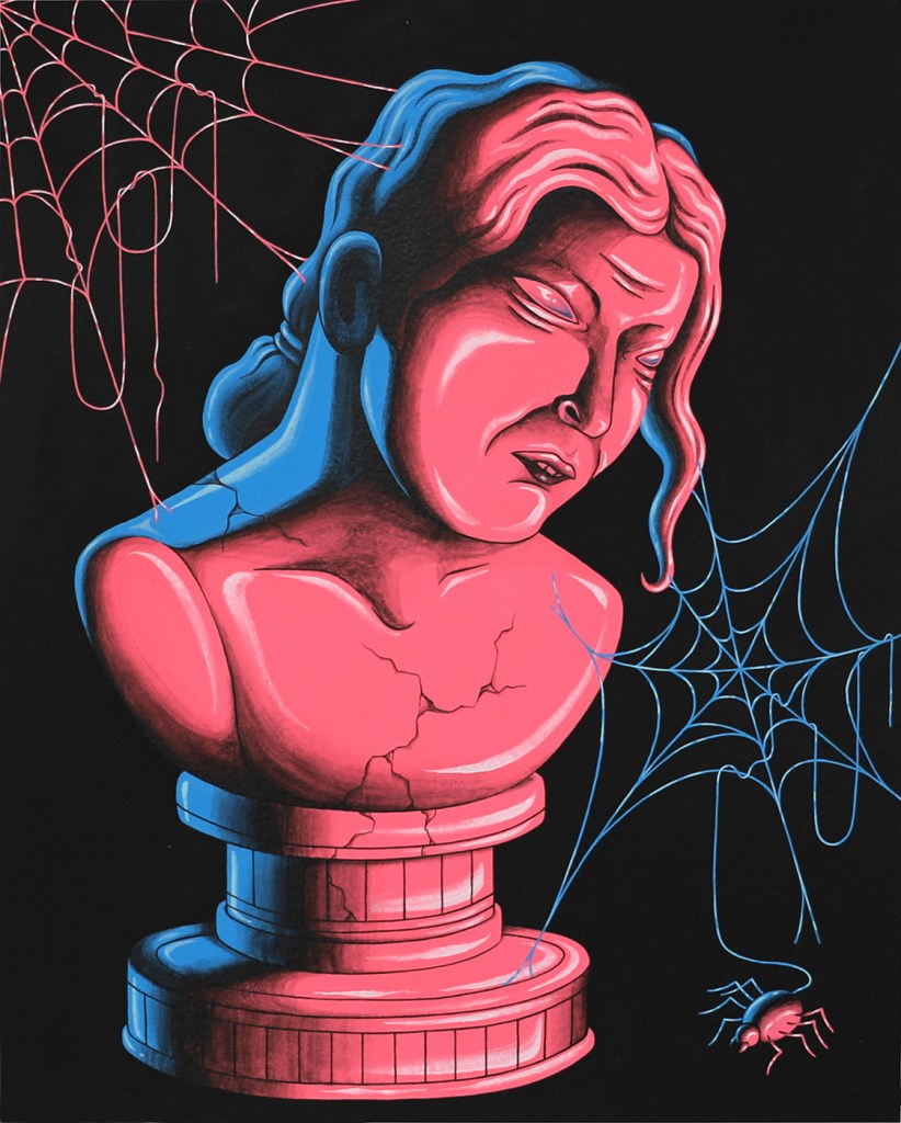 Sex, specifically women’s sexuality, is similarly de-coupled from shame. Hard Pressed presents women figures who unabashedly follow their desires. In a reversal of stereotypical roles, it is the men characters who are depicted in the periphery or the ones giving pleasure. The artist, who worked on the pieces for the show during the time that the US government overturned Roe v Wade and jeopardized access to abortion, was particularly thinking of gendered power dynamics. “One of the main pieces of the show was heavily inspired by 1973’s The Wicker Man and the visuals from that. At the same time, I was reading The Handmaid’s Tale and The Bell Jar. The ‘Wicker Woman’ piece was a direct response to how I felt society has been historically and contemporarily: bullshit.”