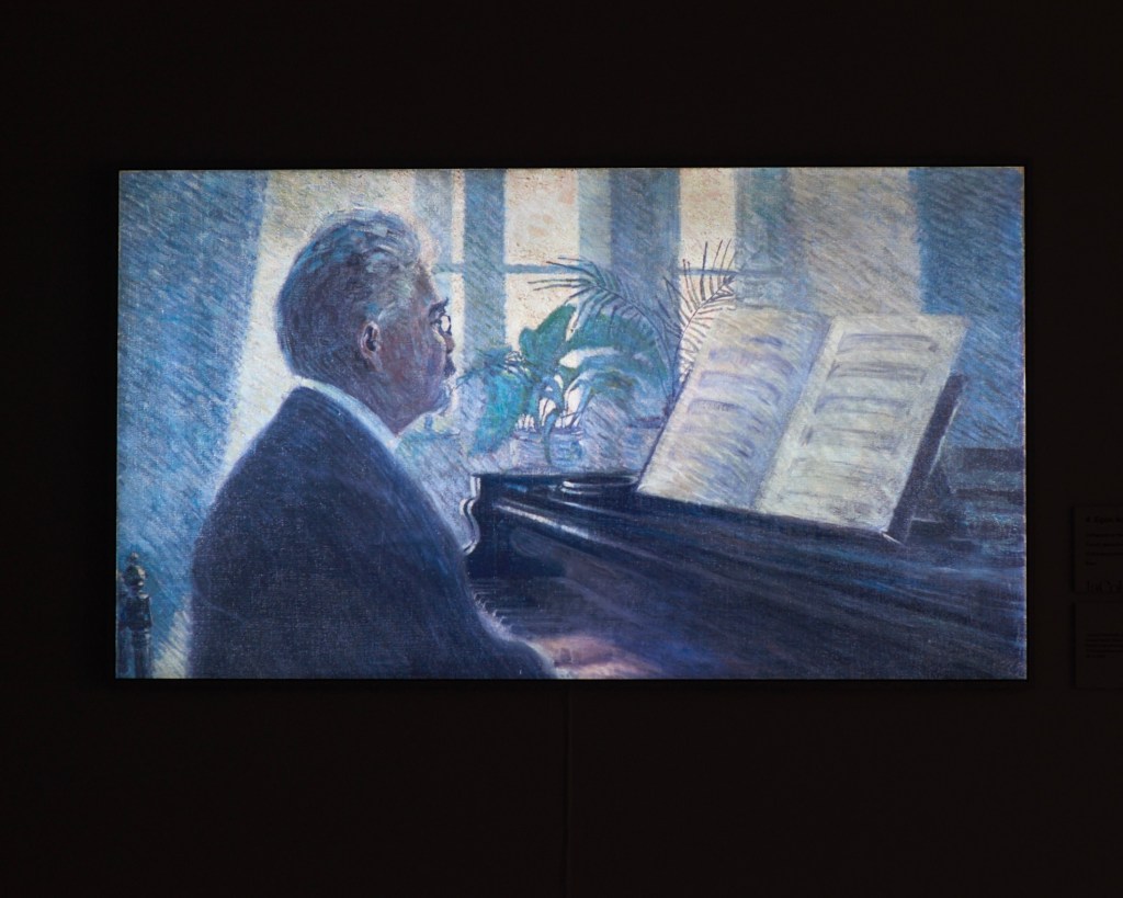 Upon arrival, guests step into a space cast in moody, low light and a Schiele quote illuminated on the wall explains it: “I paint the light that emanates from all bodies.” As such, the light source in the exhibit is that of each individual digital artwork glowing from its frame. Though some of the NFTs are static, others—including two Schiele masterpieces—are kinetic. Captured by a video producer, they move into close detail and reveal unexpected color and texture (including Schiele’s own fingerprints). On one recessed wall hangs an NFT of the rediscovered piece, which the artist painted when he was 16. A projection on another wall features a revolving display of captivating digital artworks from contemporary artists represented by the Annka Kultys Gallery.