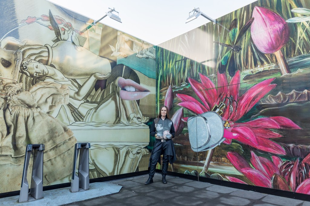Linder’s vision for her artworks was inspired by Moki Cherry’s idea of “the stage as a home, and the home as a stage.” Here, the “station is a stage and the stage is a station,” she says. “We’re surrounded by billboards, often with mundane adverts and messages. This is such a unique opportunity to say something over 12 months and so many people will see it. My billboards are a stage of sorts, with various characters performing across them.”