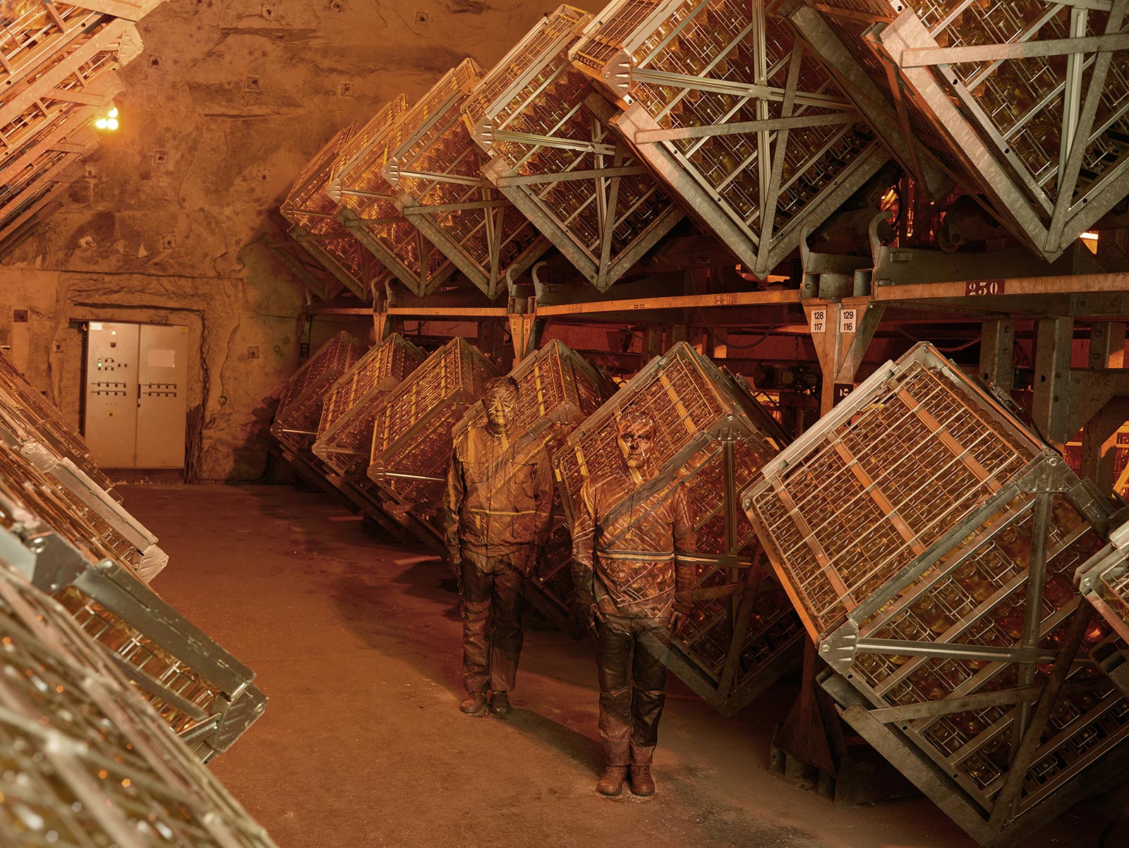 After Ruinart reached out, Bolin accepted the project (within 24 hours of the ask) as a way to “understand more deeply the culture of Europe and champagne,” he explains through a translator. Location is central to his work and the maison’s eight kilometers of caves appealed to his artistic interests. Upon arrival, he was surprised. He couldn’t imagine such a place. “I am very sensitive to color and form,” he continues. “I’d never seen photos like that before,” he adds, regarding what he knew he could produce. Entering what felt like such secret places and learning the specific and time-tested process of champagne-making, Bolin decided to highlight the employees working on site, as well. “It was important for him to shed light on these people,” the interpreter notes, because they are fundamental to the space. Bolin and his team dedicated two or so days each to capturing the final image.