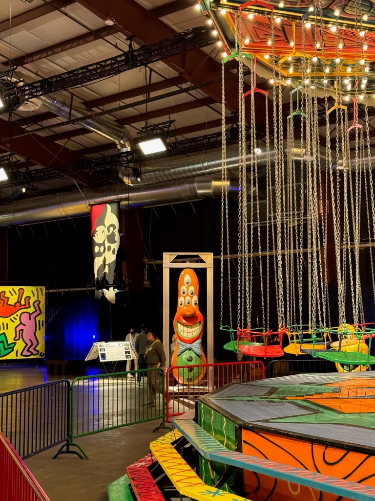 Haring’s carousel is composed of seating made out of colorful versions of his outlined people and animals. Scharf designed his own version of a chair ride, known as a wave swinger, as well as free-standing large cartoon figures. The exhibit shows these attractions, and a few others, with archival photos of the process of planning and assembling all of the elements. An elaborate timeline flanks one wall—and a small amphitheater is set up to show film footage to help imaging what it was like to be there in 1987. And although there’s much credit given to the past, the owners of Luna Luna imagine a future where a new contemporary art version of an amusement park is created.