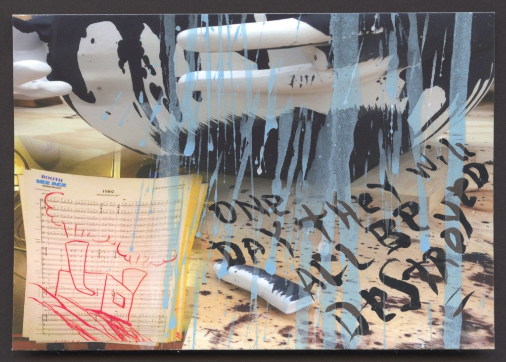 Mark Mothersbaugh: I became involved in mail art in the late ’60s, and the idea that a teenage nobody from Akron, Ohio could send a piece of art to someone like Jasper Johns, Robert Indiana, Irene Dogmatic, the image bank, art farm, etc, and you might get something back (all of these artists sent me something after I sent them artwork) was an amazing experience. I felt like I was somebody when I held up a card from Jasper Johns that had arrived in my mailbox. Beatie is an energetic positive artist that I only became friends with after the passing of a dear friend we shared. We had been loosely talking about collaborating on something, and when she suggested this idea, it rang true to a post artist, former stamp-collector, super-nerd who does not want the post office to get destroyed by the government. I draw/paint/print/etc on card-stock every day, so this seemed like it was a good fit.