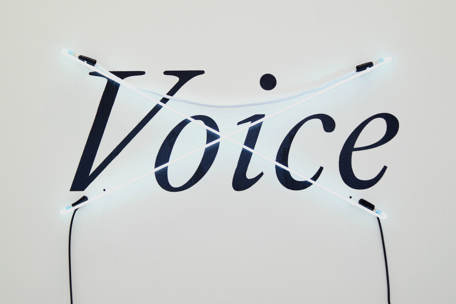 “Voice” (2015) by artist Maurício Ianês plays on the definition of the word it portrays. The text is painted, offering a visual voice, but it is both amplified and distorted by the neon lights positioned atop the word. Art does provide a voice, and the artist hints at this, but there’s a sense of restriction to the piece—only, it’s light acting as the interference. The multimedia piece was presented by Y Gallery at this year’s Untitled Art Fair.