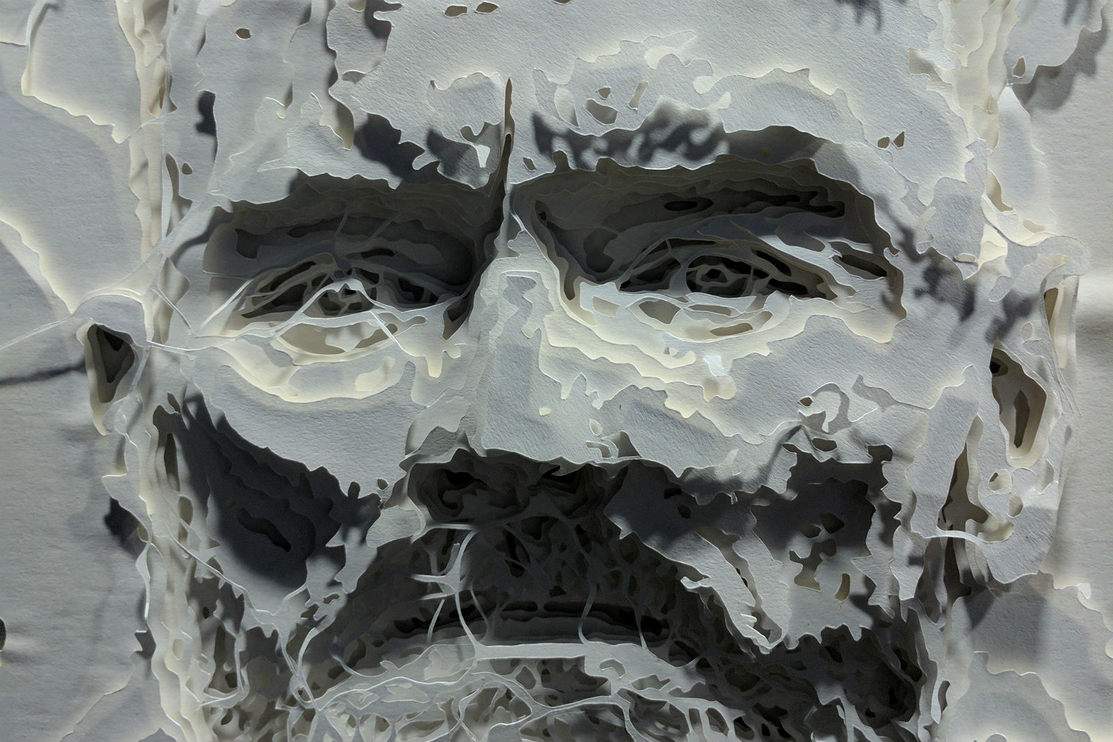 SF-based artist Carlo Fantin‘s paper work “Oldman” (2016) distorts the human face by way of its dimensions. They layering of his source material both creates and confounds one’s perception of the figure within. Seen at 7th annual Bombay Sapphire Artisan Series atop the iconic 1111 Lincoln parking garage (designed by Herzog + de Meuron) and shown in detail here, tremendous value comes from the sculptural essence of this work.