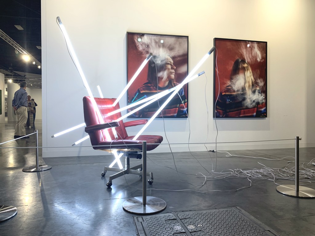 Introducing the Kurimanzutto Gallery booth, also at Art Basel, Sarah Lucas‘ “Exacto” strikes fluorescent tube lights through a red desk chair. Of course, the glow is a magnet for passing eyes, but the meaning here leaves so much room for interpretation. For many tethered to desks, this is a sculpture to consider.