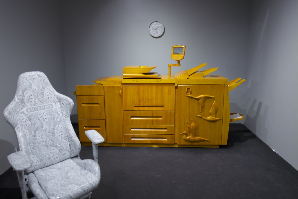 Mashing up Balenciaga’s consumer tribalism with inspiration from his early work as a clerk in a small Russian design bureau, Crosby Studios founder Harry Nuriev unveiled “The Office” during DesignMiami/. Nuriev’s furniture subverts the fashion brand’s name—or perhaps vice versa. He’s carefully carved (and embroidered in certain instances) “Balenciaga” into an office chair, an air-conditioner, a large wooden photocopier and more. Aside from the social commentary, these are beautiful design pieces, too.