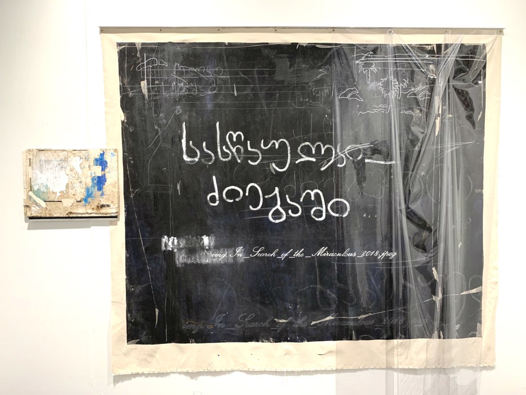 Layer upon layer of Levan Mindiashvili’s 2018 piece “In Search of the Miraculous” unfolds with scrutiny. This work—at the same time—is and isn’t more of a two-dimensional sculpture, employing a tapestry-like chalkboard background partially covered in a plastic curtain. The text in Georgian—scrawled on the work—is grammatically incorrect, lending curiosity to the creation. It was seen at Georgian gallery ERTI‘s booth during New Art Dealers Alliance.