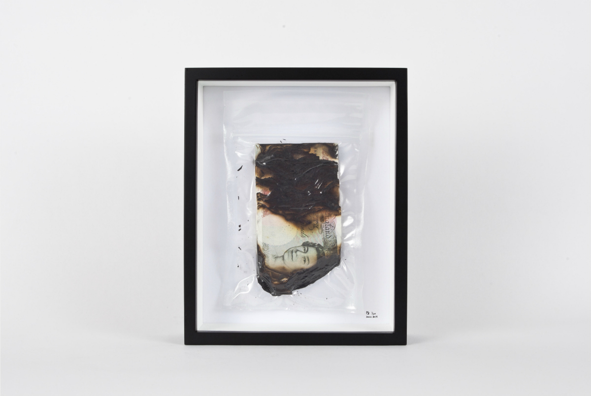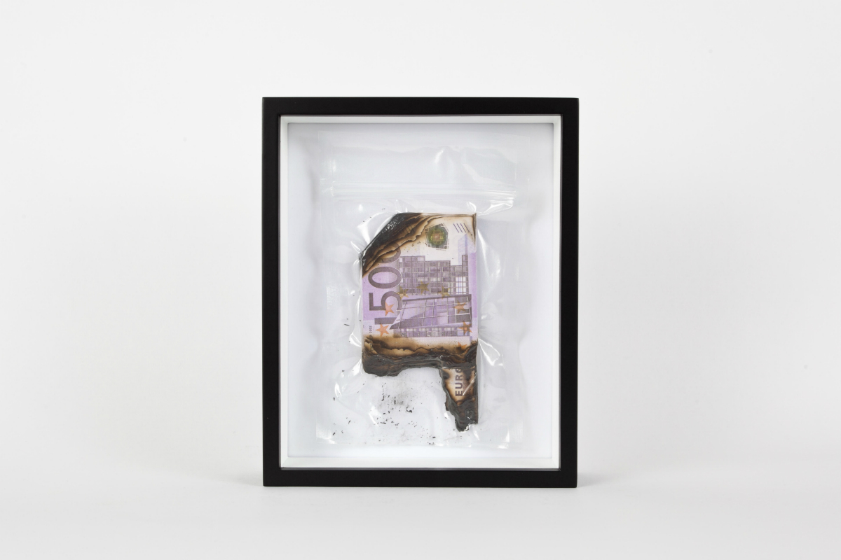 “Eventually, the sealed contents started to tell what felt like more important stories, he says, “So I began to explore what would truly change once it was sealed.” Spear began acquiring various banknotes and sealing it, or burning it and then sealing it. “I became more intentional with the story I wanted to tell, while creating this image of destruction.” This honed his vision and lends the series a concise conceptual edge: rather than tackling the sentimental and superficial, Spear is addressing our deep fixation with money as an object.