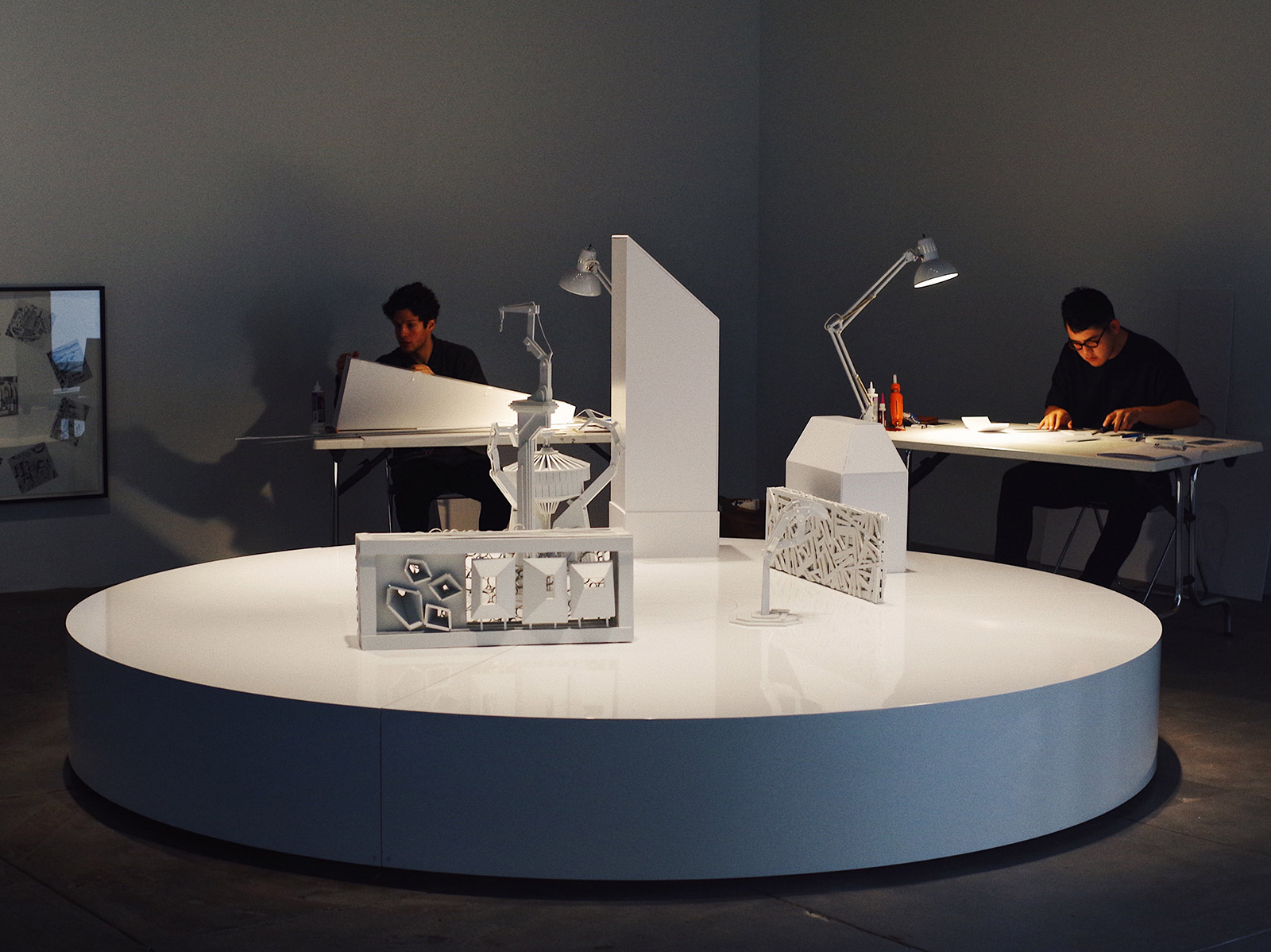 Much of the fun comes from the crashing of ideas, of sculpturally imagining a fake city, playing it out in so many different forms. Simpson distilled this idea of “everything happening at once.” The show is “sculpture that’s also a stage set that also has a movie that also has actors based on a photograph that produced drawings that can be made into an installation.” Everything is in tandem, a super-heroic maximalism.