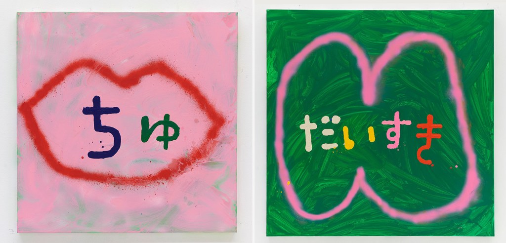 When I speak Japanese, I use onomatopoeia a lot. So this time I use some onomatopoeia on paintings. Kind of happened naturally to use these words. Also, there is a similar emphasis on text in my exhibition now at the NGV Triennial in Melbourne. We even made a publication called, Moja Moja Means Hairy.