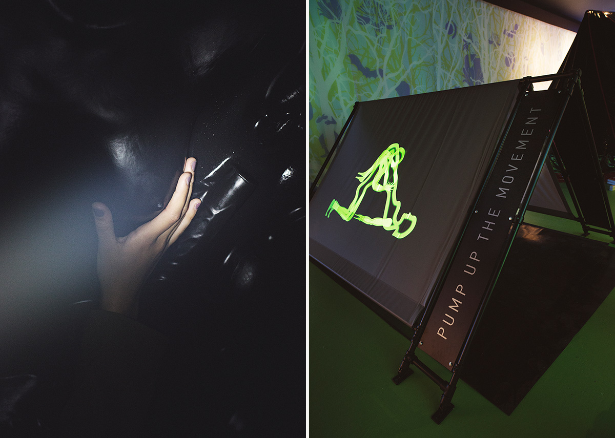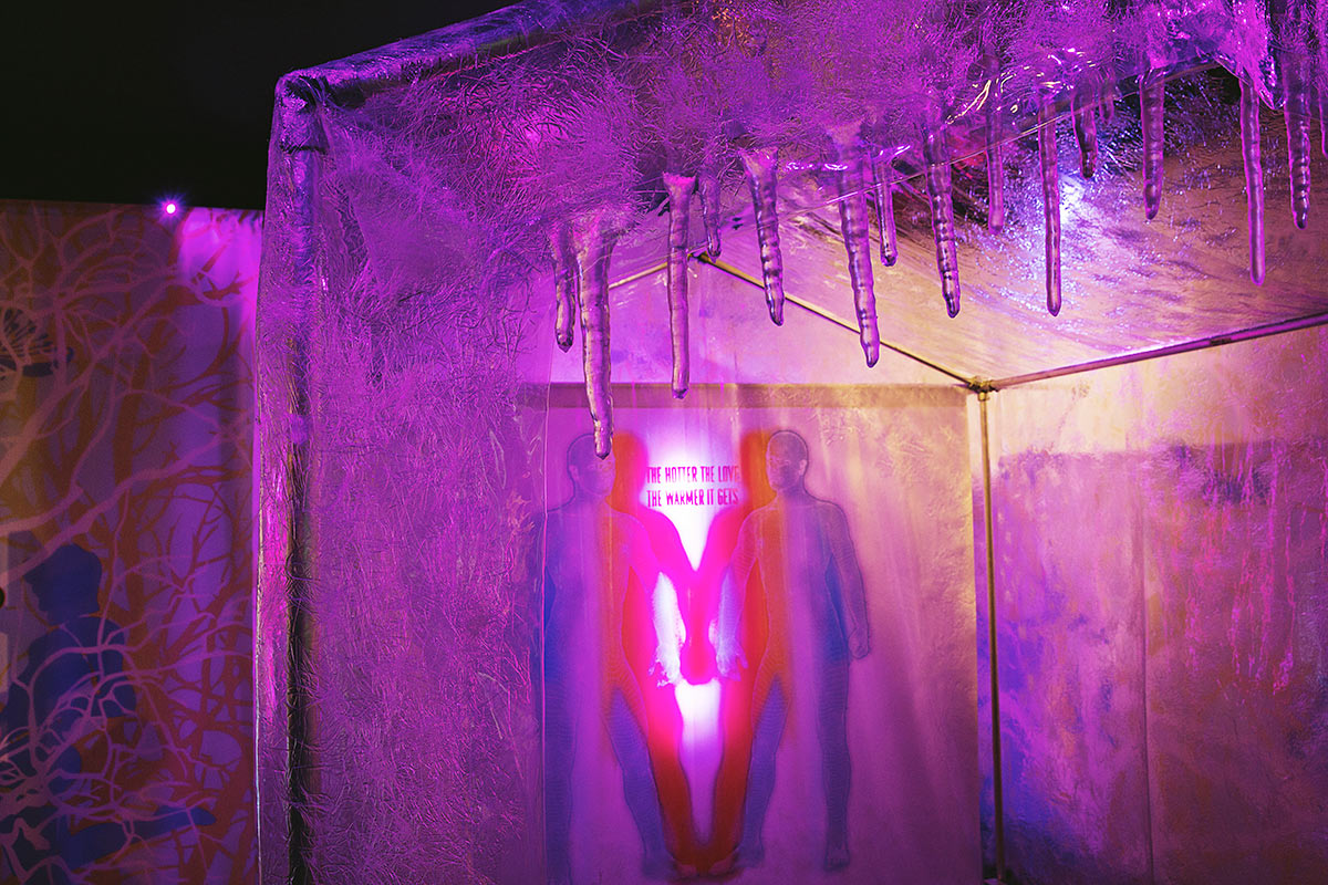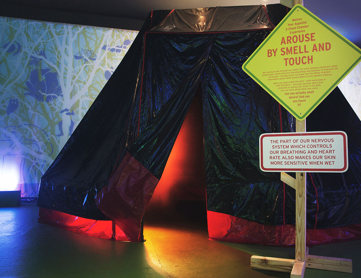 The rest of the journey traverses other small-sized tents like “Grass Girl Arouses,” which beckons visitors to lie down and pet a bristly sculpture of a girl (who’s whispering sweet, gentle words of seduction) to the “Ice Oven Challenge,” which uses heat sensors to take things from cold to hot upon your entrance. The highlight is probably the darkest tent: “Wetten Your Appetite” is a “cloud chamber experience” (that feels more like a Berlin club basement) where smell and touch take over. The tent is filled with aromatic fog and lit only for brief moments by a stroboscope. Groping the walls is highly encouraged here, as body forms—a leg, a face, nipples—molded from soft, black latex surround you. In such a shadowy and steamy space with strangers, let the pheromones run high and see how your body adapts when vision becomes limited, and other senses sharpen.