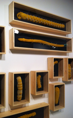 An installation of framed nylon socks filled up with foam show off the artist’s experience “controlling and designing the dynamic form which the foam permits,” he explains of the neck-like sculptures.
