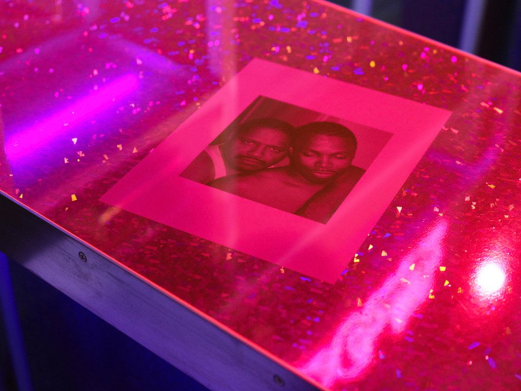 Far from an exact replica, the artist’s recreation transforms her familial history into a pink, glittery fantasia that simultaneously honors her own personal archive while creating a collective one. The installation glows—physically through neon-lit signs and figuratively through the photos from Barnette’s own archive, enshrined in the shimmering countertop. While sitting at the bar—surrounded by the sparkly tape player, beer cans and stereo equipment—guests are prompted to wonder: who came before? Who were the Black and queer activists who paved the way for this barstool to be available?