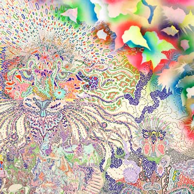 While studying photography and video, Bharoocha’s compositional experimentation took a new direction as the inducted drummer of Black Dice, a progressive noisecore ensemble. Inspired by flyers accumulated from years of touring and the art of fellow bandmate, Bjorn Copeland, Bharoocha started to explore the artistry of collage. His art pairs psychedelic imagery with naturalistic elements, assuming an otherworldly quality with undertones of hyperreality that has garnished exhibitions ranging from D’Amelio Terras gallery in New York, to Vleeshal, a state-run space in the Netherlands.