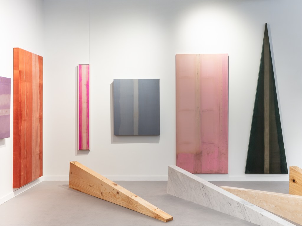 Based in Athens, Georgia, gallery owner Tif Sigfrids adorned one wall of her Felix installation with a vibrant, geometric piece by NYC-based artist Margaux Ogden—that stayed with attendees long after they moved into other rooms. Ogden’s piece was pulled from a series that she painted while on residency in Rome. “I spent a lot of time at the Baths of Caracalla, drawing from the ruins,” she told me on site. “It started as a series of water colors that then turned into these paintings. There’s a form that references the floor mosaics in the Baths of Caracalla. It all starts with that same spatial logic but I left room for intuitive developments.”
