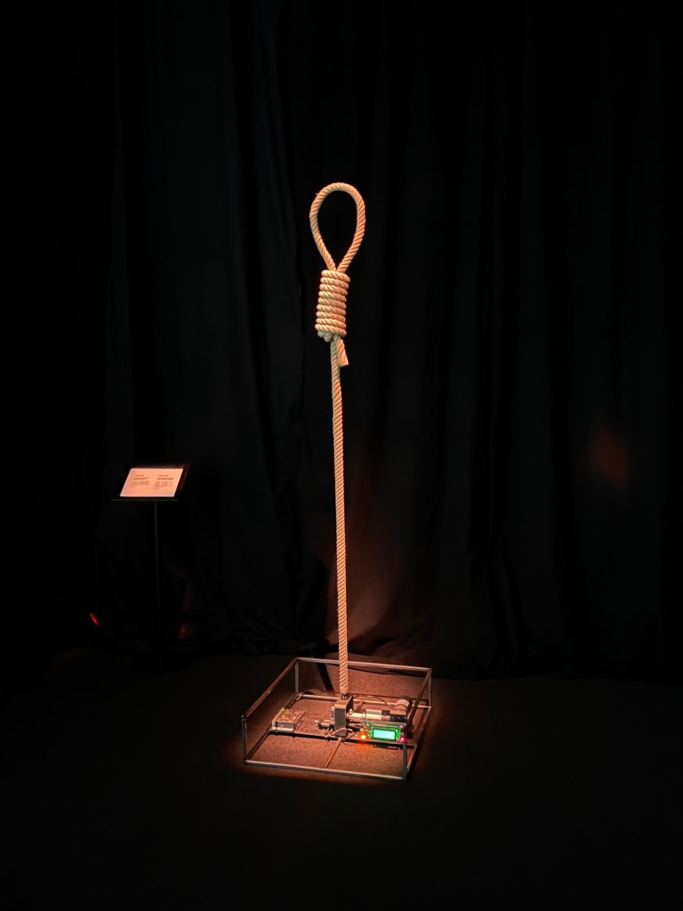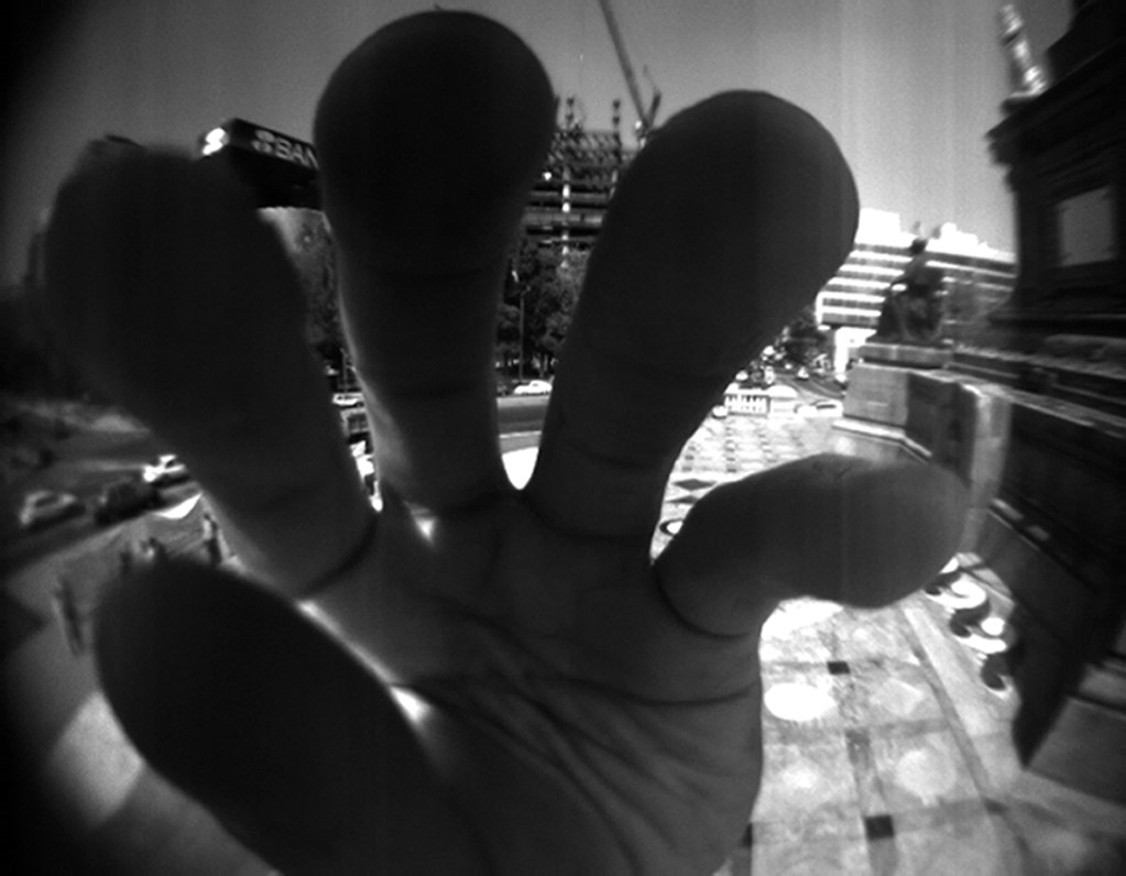 Where “Thermal Drift” playfully refashions surveillance technology (while acknowledging its power for violence), other works like “Inspired By Real Events” take a more directly subversive stance. “That’s quite an old project,” Lozano-Hemmer tells us. “It’s now 20 years old, and it was basically the documentation of an intervention I did in public space in Mexico City. In 2003, we went looking for important surveillance video cameras in Mexico in emblematic places like El Ángel de la Independencia or Independence Angel. We brought a ladder and asked volunteers to go and turn off the cameras, and so what the video is recording is people going up this ladder putting their head, their face, in front of the camera and literally turning it off and you have these deformed fingers just reaching out.”