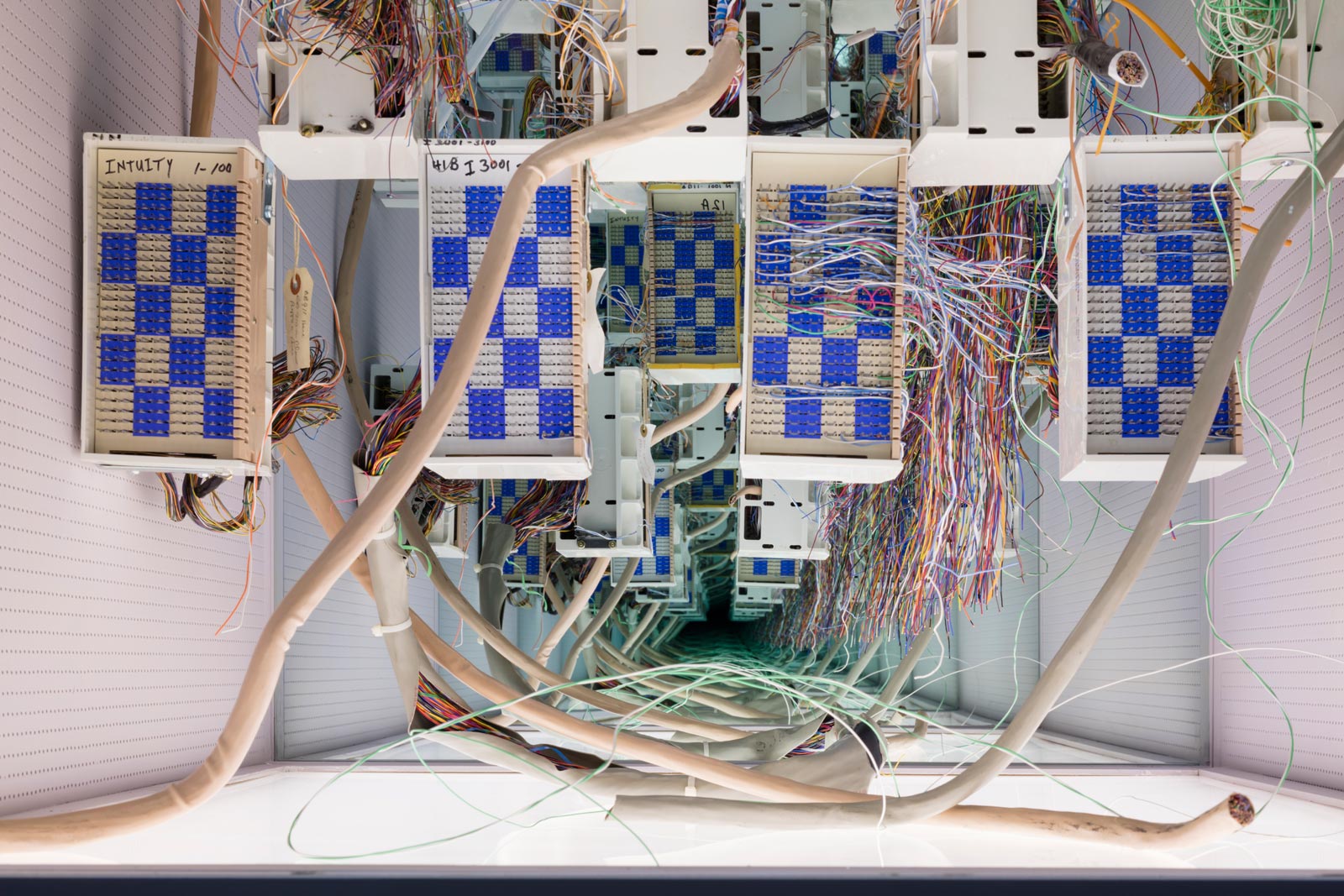 “The very earliest thoughts [about this concept] came from my dreams — petals and pixels, petals as pixels, in swarms and twirling,” Meyohas explains to CH. “The dreams were rudimentary — they’re just brief visions. I don’t usually remember my dreams, but these images kept coming back. I started to think about why I couldn’t get them out of my mind… Interestingly, those early images and dreams are a very basic version of the virtual reality pieces, which were the last part of the project to be created.” When walking through the space, visitors must first confront the archive wall of 3,289 petals and the sculptures of antiquated telephony components exaggerated by two-way mirrors. These tactile manifestations had to occur well before the artist would fully immerse herself into the digital world.