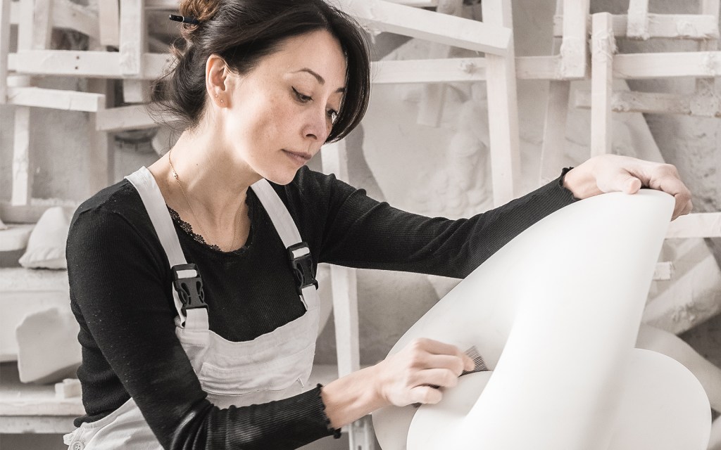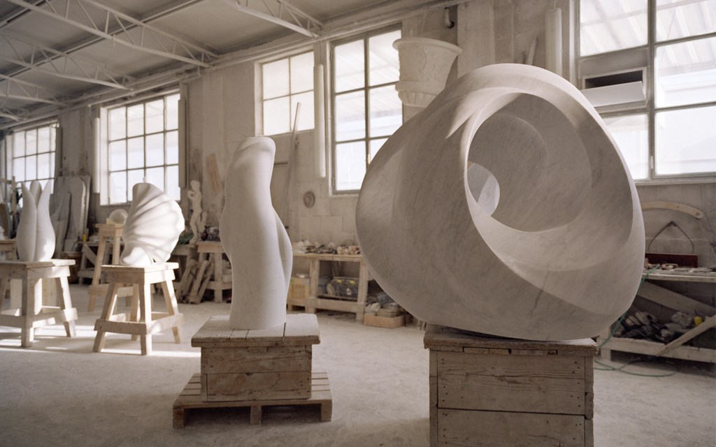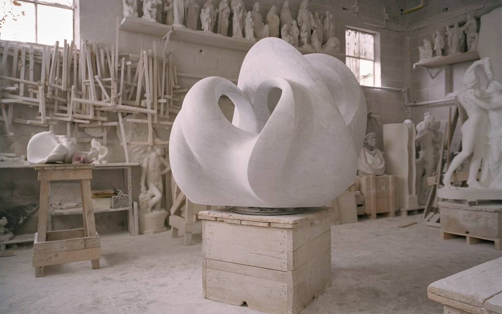 “I have a small studio just outside the town center of Pietrasanta,” Kubrick tells CH. “It is a simple little building with high ceilings and large doors that open to let the air and sunshine in. I collect antique sculpting tools and gessos which adorn the walls of the studio. Outside, there is a small garden area where I keep marble blocks. I also work with a commercial studio nearby alongside other sculptors and artisans where we have access to large-scale machinery, forklifts, cranes, saws and tools needed to execute large-scale work.”