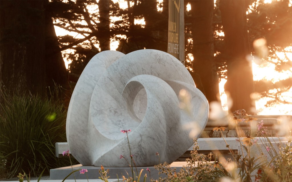 This very rhythm flows through Kubrick’s works. Languid and lavish, her pieces twist and wind as if tasked with chasing each’s own tail for eternity. Kubrick’s 2018 work “Tides“—a 244-pound sculpture chiseled from Carrara and Bardiglio marble—swirls into itself, a sea of clashing waves bound for opposite edges. The three forces comprising each inward wave represent the past, present and future. It can be found on the University of San Francisco’s campus, set before a line of trees.