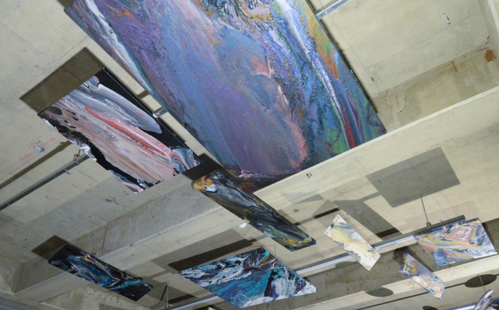 The work of Y∞n1verse expresses all the values of Punto Blu. Entitled “Flow-in: 유영,” the show features immersive video work, installation pieces and several paintings. It is her paintings that truly tempt the imagination—with each appearing as a snapshot of storm patterns on cosmic bodies. Texture yields vibrance and colors give way to atmosphere. The curatorial team hung the works everywhere, including the ceiling. To stay among them, visitors understand why.