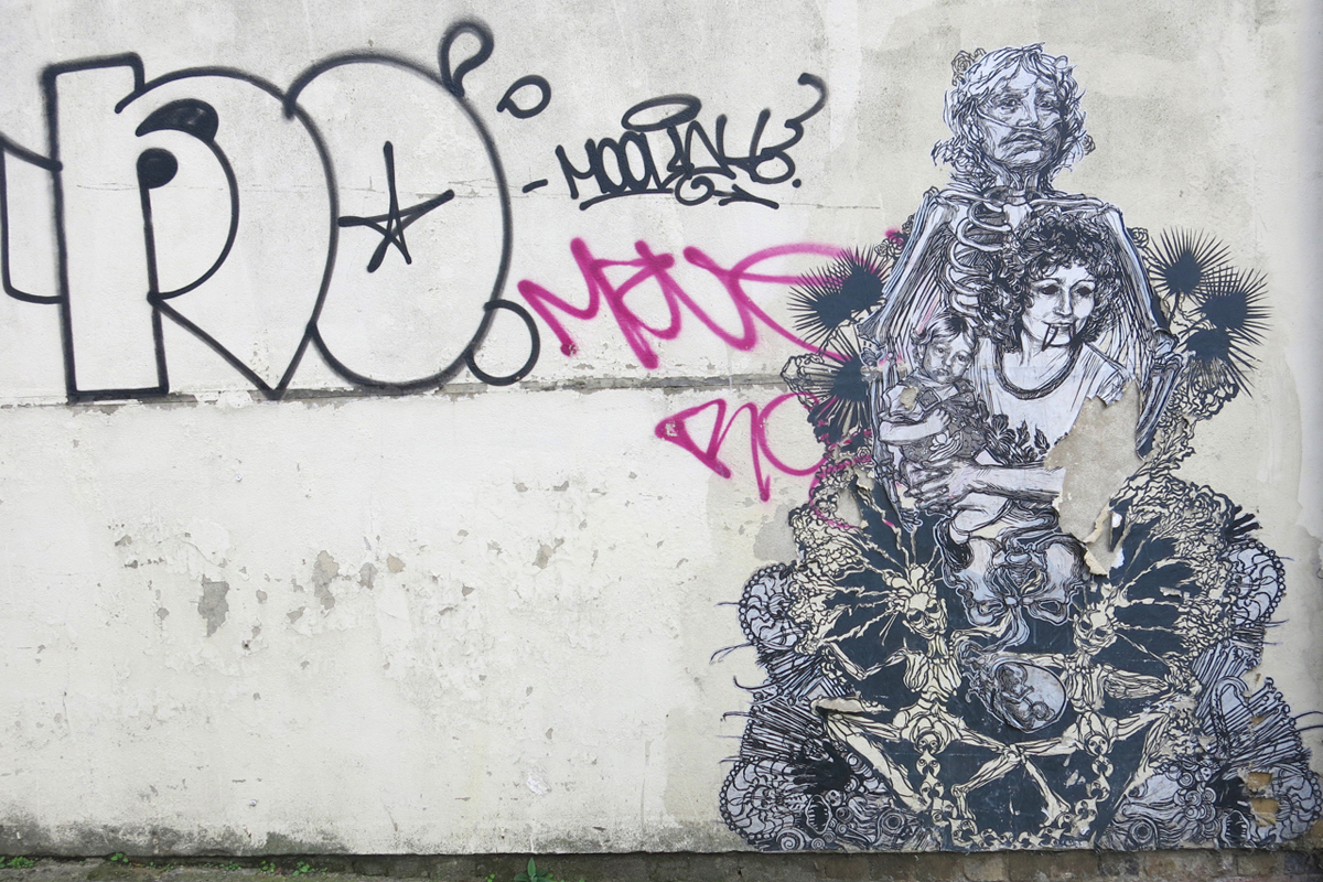 It’s a freezing Monday morning in London and commuters hurry past, heading to the warmth of the Bethnal Green tube station, as Karim Samuels introduces the history of graffiti and the artistic legacy of East London by pointing out stickers covered in tags. It’s the beginning of a thorough three-hour tour with the London-based graffiti writer and expert, who is one of SideStory’s insiders. Samuels, who trained as an architect and came to London from his home country of Zimbabwe, leads his group through an alleyway to see nearby work by Donk, Zabou and Sway. His knowledge of London’s graffiti and street art scene is evident: Samuels knows its ins and outs, the writers’ backgrounds, when the pieces were created, and its rules. “You never spray private houses or cars, hospitals, religious places,” he says.