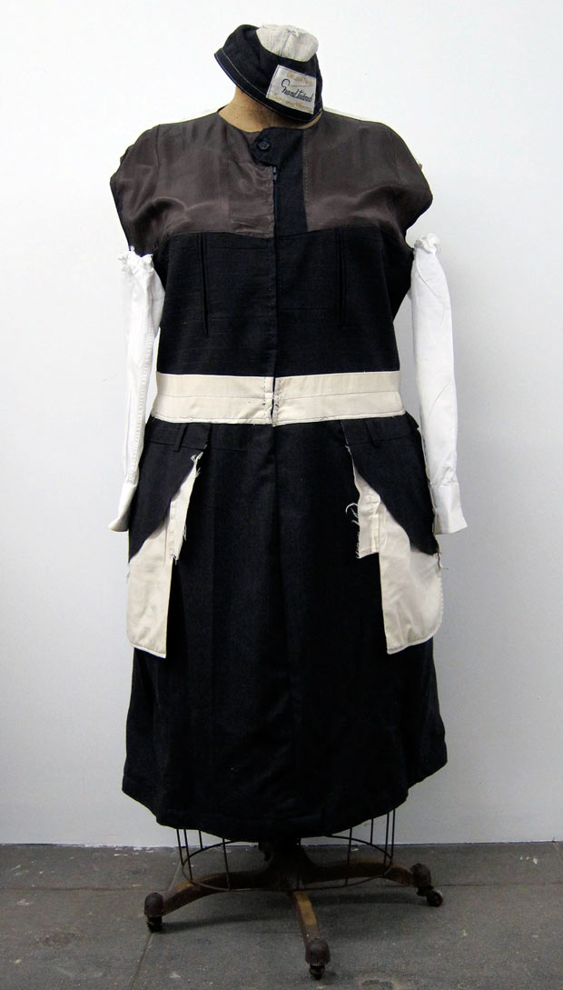 Performance artist Carole Frances Lung’s installation features her Bauhaus-inspired Knock Off Enterprises as well as several of her performance uniforms displayed on dress forms. She shares her handmade journal scrapbooks chronicling Frau Fiber’s projects including the Triangle Shirtwaist Fire, bicycle-powered sewing machine and Haiti projects. According to Lung, Frau Fiber communicates her identity through the uniforms that she makes herself: “Frau is a former East German garment worker turned activist after her job was outsourced to China,” says Lung. Frau’s uniforms that are part of Social Fabric include the Useful Work vs. Useless Toil uniform that is inspired by the William Morris essay of the same name. Frau hacked apart a men’s suit and reassembled it as a boxy house-dress with a corresponding cap.