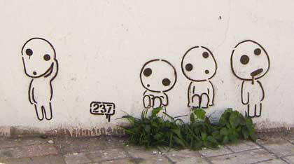 237 is an urban art project that started in Malaga, Spain. They supposedly have a website coming soon. Other than being incredibly cute, the little guys featured above are a direct reference to Hayao Miyazaki's animated film Princess Mononoke, where they're the tree spirits known as Kodama. From the looks of it, it seems they've left the forest and headed for Spain. I can't really blame them, though.