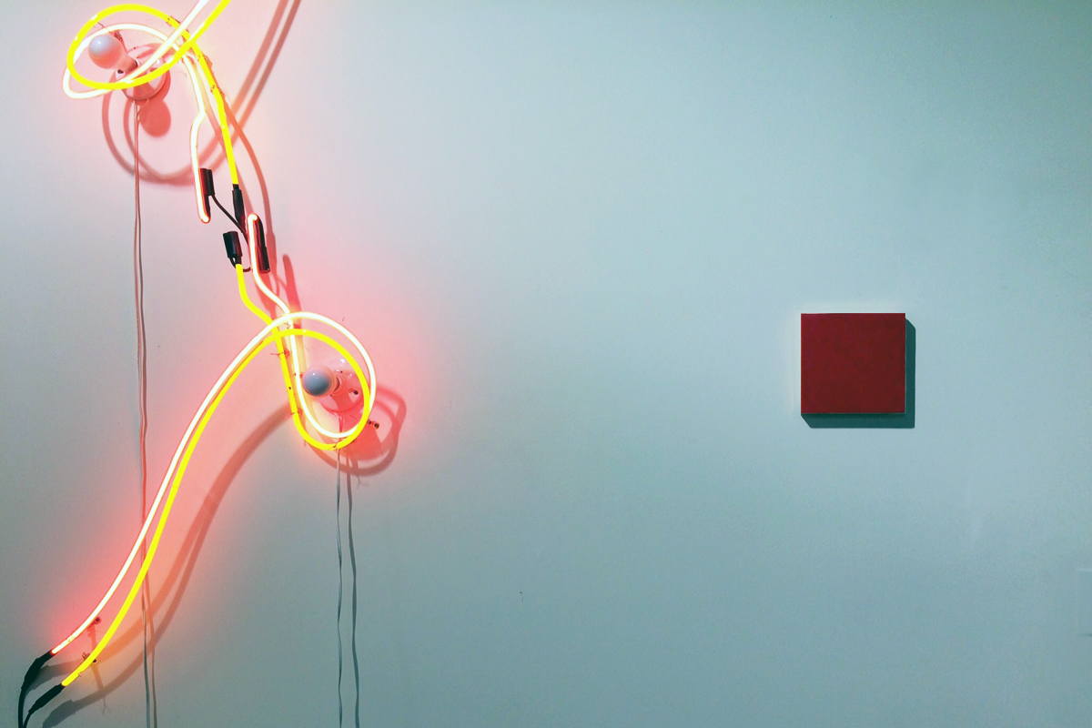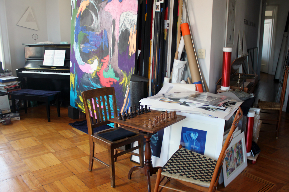 The tableaux Bradshaw assembles throughout the space are curated from the works of friends—colleagues central to one of the past century’s most acclaimed artistic movements. A maquette for Claes Oldenburg’s Mouse Museum perches on a Sol LeWitt vertical shelf/sculpture, adjacent to a work Robert Ryman signed and dated to the column. Winking homages best labeled “after Duchamp” abound. A bottle-rack hung from the ceiling—strung with lights that absorb daylight and illuminate indeterminately—is a ready-made chandelier. “What artists take from Duchamp is permission,” suggests Bradshaw. Her score for “Angles” (a series in which the roll of a die specifies the horizon of a triangular painting each day of its exhibition) sits at the upright piano.