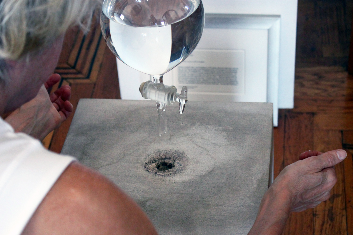 In “Waterstone,” a funnel focuses and regulates a steady drop of water on porous limestone. The depth of localized erosion depends on how long a piece has been “active,” a testament to Bradshaw’s 19-year devotional. In another work contending with material change, white calcareous tufa stone, freshly quarried from Denmark specifically for the exhibition, bleeds traces of chalk in its “youth,” but hardens and darkens with age.