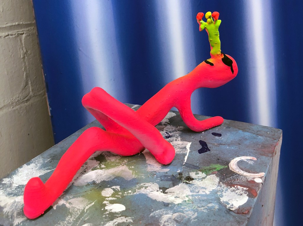 One of his sculptural works is a fluorescent-pink Gumby-type character, with limbs askew and a bouquet of flowers sticking out from his nose. The figure, with dark sunglasses and a smile, stares up at the ceiling. For this, Lee employed a VR program called Medium. Here, he creates images inside the program and then uses a digital 3D printer to make them into real sculptures. Lee was proudest to show off a sculpture that appeared quite flat but oddly interesting in its own right. It demonstrated beauty in strange imperfection. Perhaps that is the best way to describe Lee’s work.
