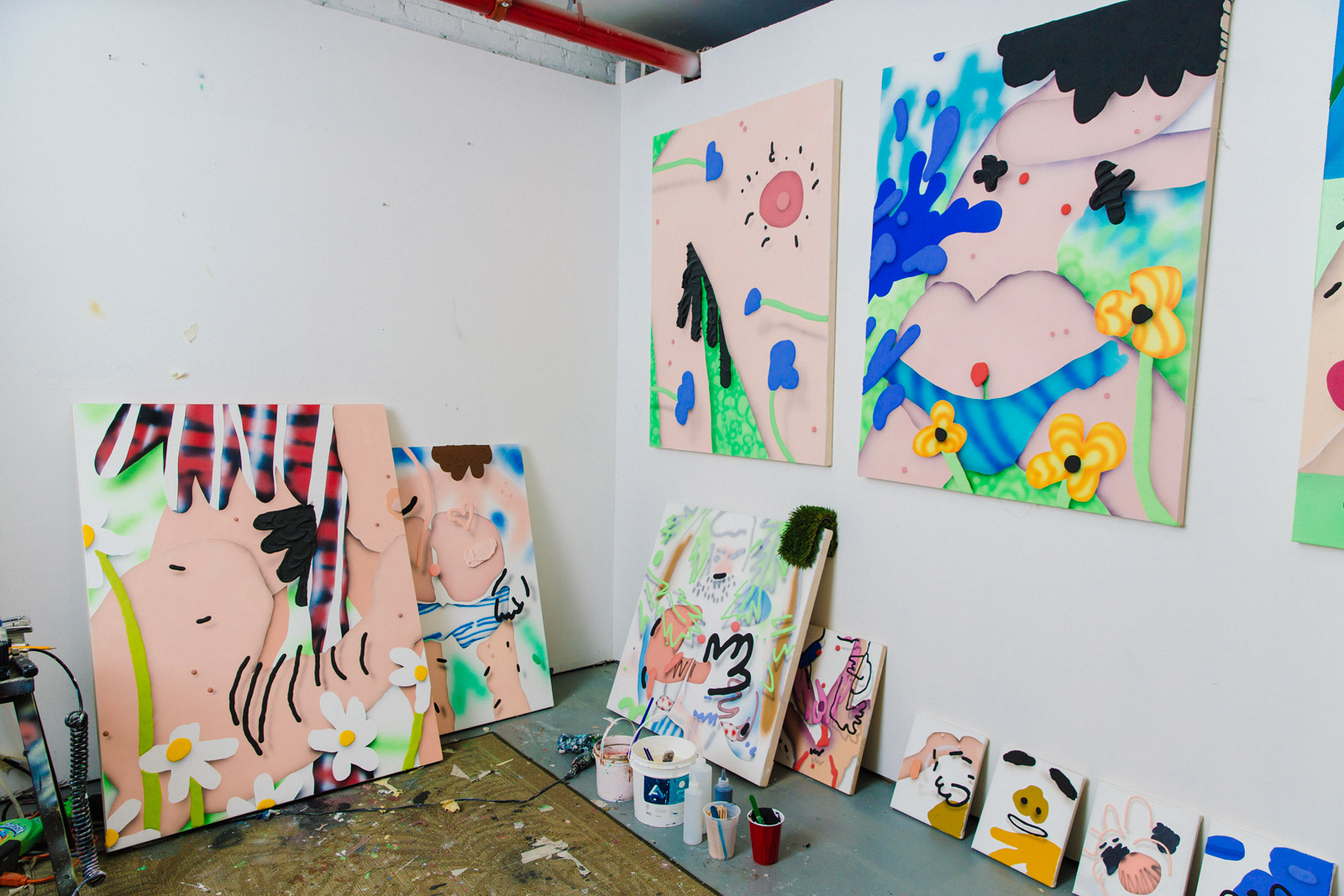 The colors used in his work contribute to an almost-whimsical wallpapering of the studio space. That said, the contents address sexuality and heightened reality. “A lot of my color choices in the past have been artificial, or super-bright. This use of color speaks to working in a digital landscape where you can select a color from different softwares,” he explains. “If you are thinking of working solely from life, for instance with a traditional still life, you are limited by the reality of things. You are influenced by the light you see. In the way I work, it is whatever I want it to be.” But with all bold color decision, the composition has a sparseness. “I like my marks to be very economical,” he continues. “I try to eliminate anything that is unnecessary.”