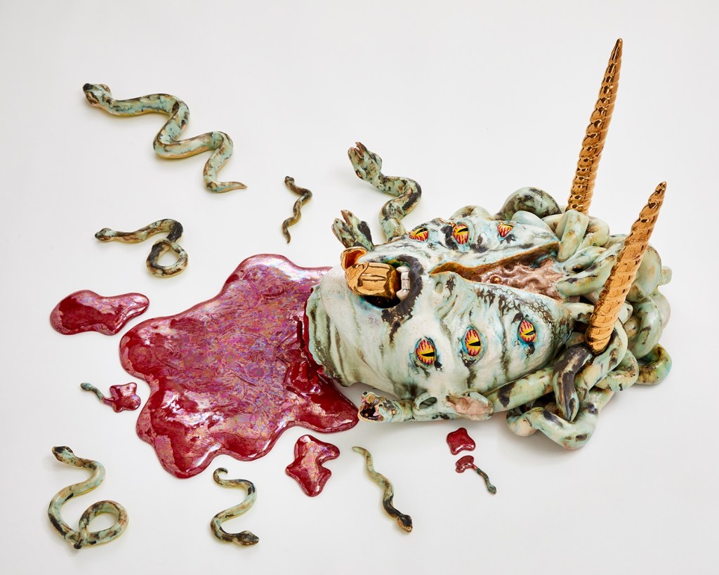 Jackson’s “Medusa” exemplifies this. “The very quick interpretation is that she is a monster. The truth behind it is that she’s a rape victim that was cursed by Athena because she was jealous of her beauty,” Jackson tells us. Reframing Medusa in shiny mystical glaze and with unicorn horns—a rendering that combines Jackson’s love for horror and science fiction—questions perceptions about who is really in the right and wrong.