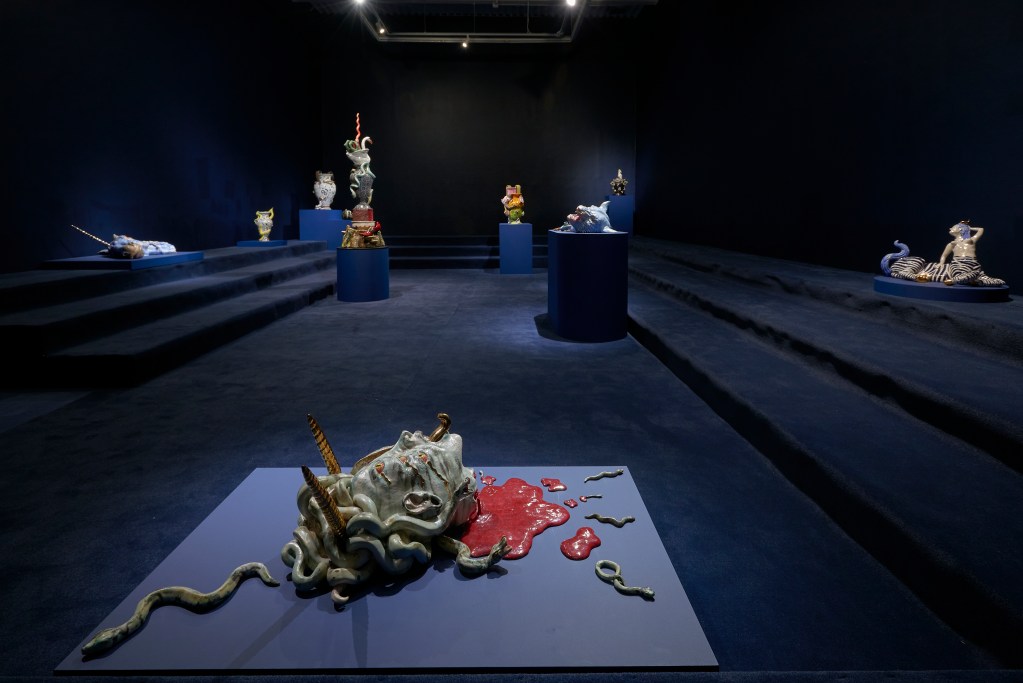 NYC’s The Hole hosts ceramicist Roxanne Jackson’s latest exhibit Nature is a Whore: A Comedy & A Tragedy, an aptly titled show of dizzying and wild polarities. Opening today and on view until 23 October, the exhibition—crafted in the artist’s studio and home in Wassaic, New York, which we toured to learn more—feels immediately bizarre and fantastical, featuring chicken feet, decapitated heads, sea shells, cakes, blood and other unexpected sculptures, but the madness is not without meaning. As much as it is suffused with the seemingly incongruous, the show is equally replete with synchronicities and unity that make the show a layered, multivalent display of artistic prowess.