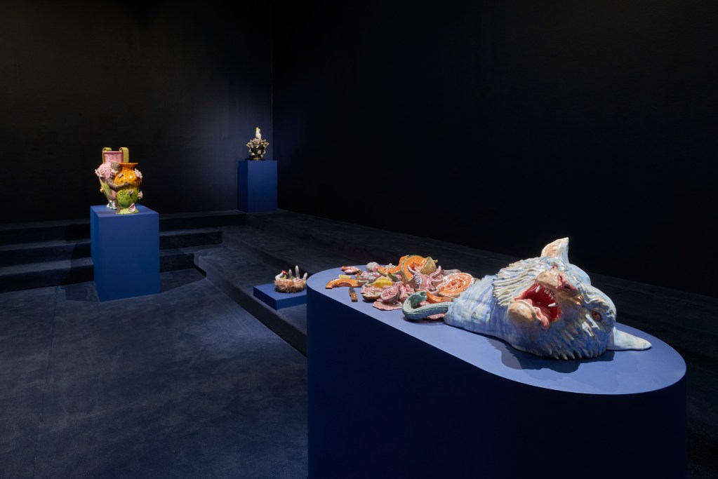 As its name may suggest, the exhibition is nothing if not dramatic, which the installation highlights well. Displayed in and around a sunken living room with deep blue carpeting throughout, the space strategically introduces the rest of the show. “It kind of sets the tone for a domestic space and or theater and theatrics,” Jackson tells us. Likewise, some of the works are domiciliary and traditional like candleholders and amphoras while others are absurdly spectacular sculptures. The duality subverts expectation of ceramics and setting, asking how domestic spaces may also be sites for performance.