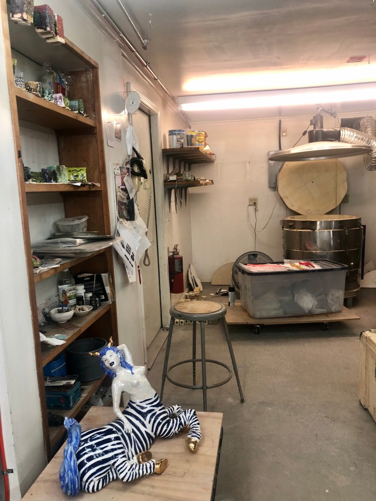 Because her process is guided by intuition, sometimes mistakes happen, but then they become a part of the show. This was the case for her zebra centaur sculpture and snake lady. When crafting the head of the centaur, Jackson had cut its head off in order to more easily get the details of the face correct. When putting it back on, she found that it didn’t fit right. After storing the head in Tupperware and making a few more pieces, she decided to attach it to a snake she had made, another instance in which the medium reveals and transforms itself.