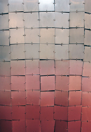 The descendent of swordsmiths-turned-priests, the half-Japanese Ando brings her family’s unconventional origins into her art. “Furisode Kimono” is a 180lbs sculpture made of steel squares that have been soldered together with sterling silver rings. The process for this work is different from the aluminum pieces, using heat rather than anodization to achieve the gradient. In both, the effect is permanent and established within the properties of the metal. “It’s embedded; you can touch it and it won’t come off,” explains Ando.