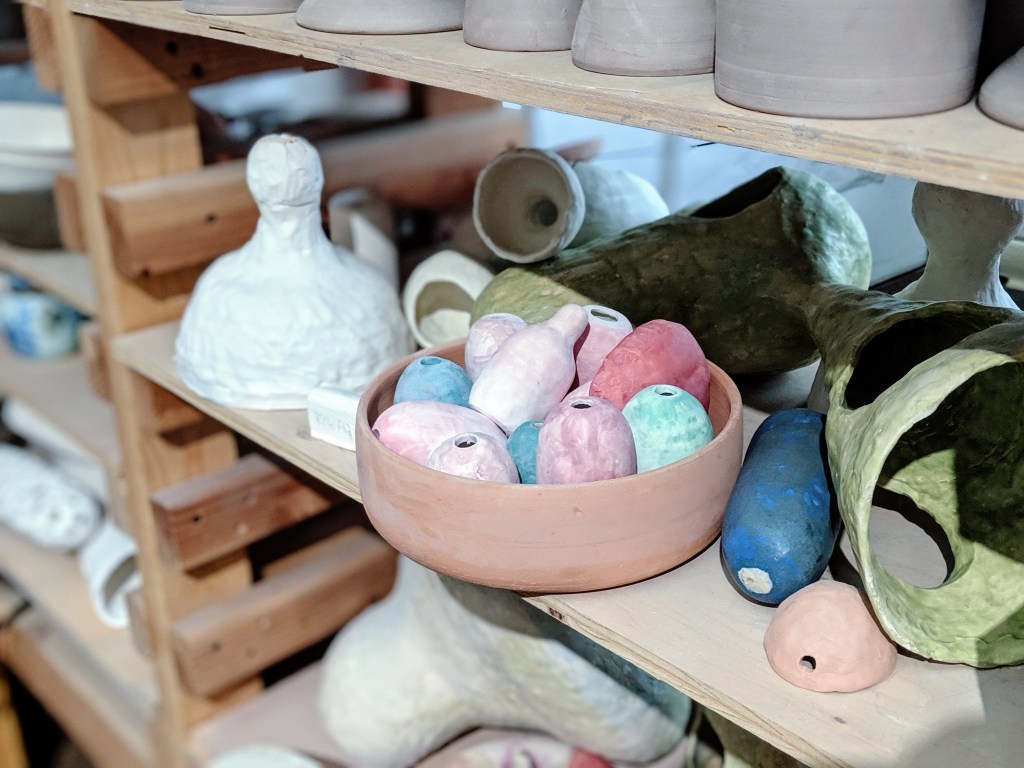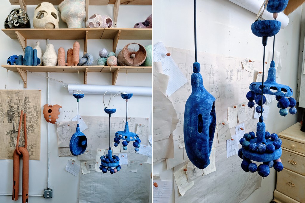 Inside her studio, alongside the hundreds of iterations she’s crafted—she mentions that her preferred escape from commissioned work is building upon existing pieces: “It’s the extension of things I made before. It’s, ‘I made this, but what if I tried this? Or tried this,’ right?” she says. There are also paintings, sculpted mugs, bowls and legs, and countless drawings that go beyond her scribbled sketches.