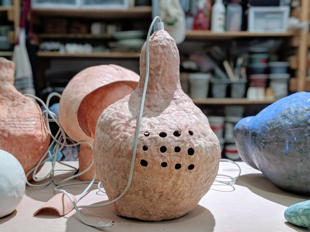 She sets out to let the clay, and her inspiration, manifest naturally. There are obvious constraints, though, given that the shape ultimately has to accommodate electrical components and hang alongside other pieces. “When I’m making things, I don’t think it looks fragile or delicate,” she says. “But then, when I see them hung, it’s like, ‘Oh wow, they’re much lighter than I thought they were.'”