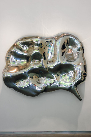 A floor-to-ceiling woodcut print comes courtesy of Aaron Spangler. Titled “Christian Separatist Home Birth”, the piece is constructed from basswood panels that were sourced from northwestern Minnesota, where the artist lives. Adjoining this piece was “Speech Bubble” by Jürgen Drescher, an amorphous silver-plated sculpture that distorts the viewer’s reflection. Spencer Finch exhibited “The River That Flows Both Ways”, a sequence of handmade paper panels that show the change in color of the Hudson River throughout the day.