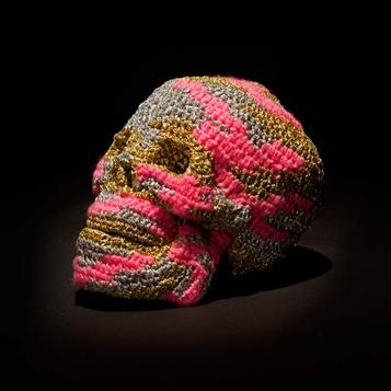 Vibrant and painstakingly executed, the crochet installations from Polish-born artist Olek offer striking embellishment to familiar spots. Blanketing NYC landmarks such as Wall Street’s Charging Bull and Alamo (the Astor Place cube), Olek’s unmistakable work has thrilled residents and tourists alike by adding new dimension to classic monuments. Her latest undertaking, The End Is Far, is a sight-specific installation at Jonathan LeVine Gallery that brings together clever messaging, intricate detail and morbid iconography.