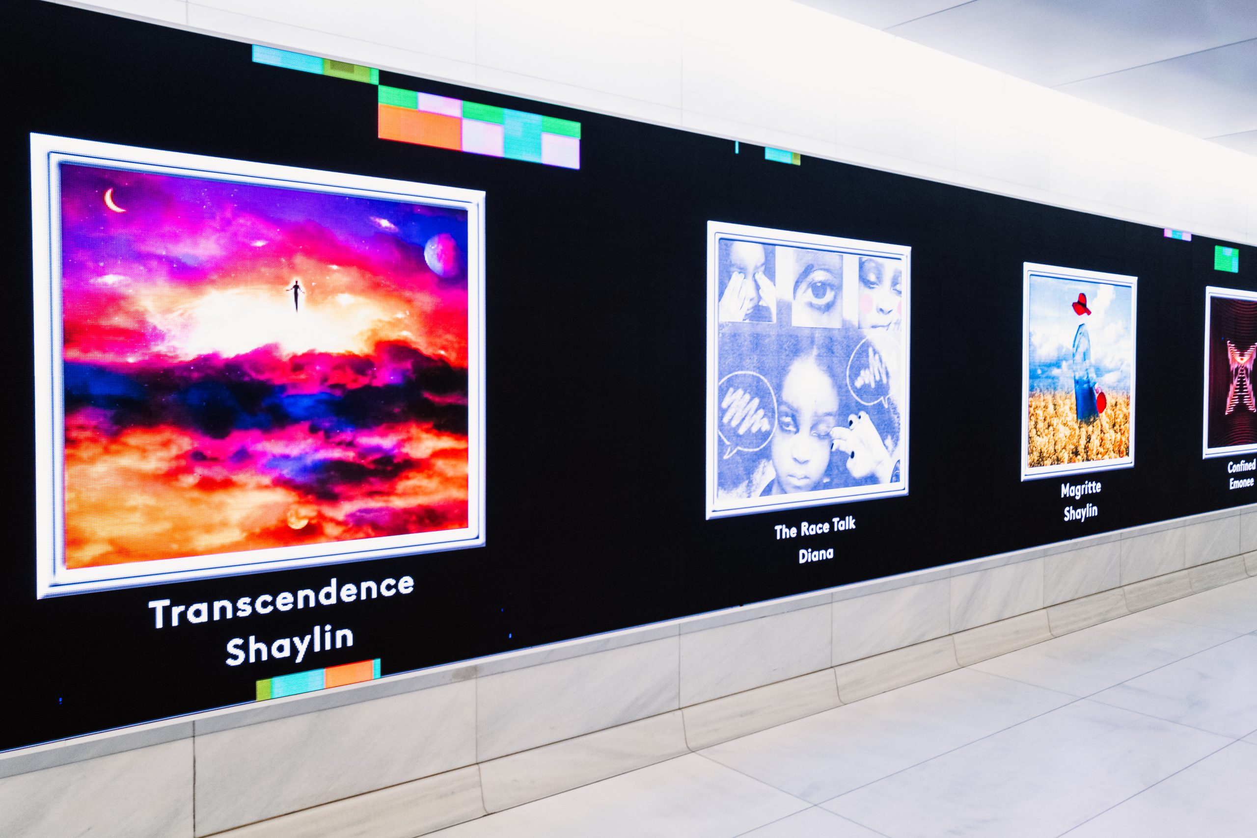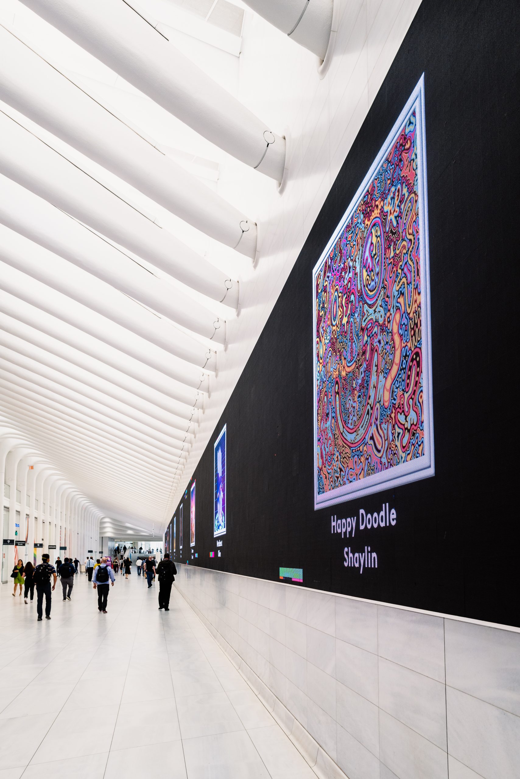 Using the 100-yard screens at the Oculus, Westfield brings the digital artworks to life in a shining display that rivals the 350-foot steel columns that extend above each wall. Westfield not only activates the art in an effective way, but they also amplify the work of the women artists. As such, they partnered with the web3 creation and collection platform Blockparty to enable people to purchase works via each screen and online.
