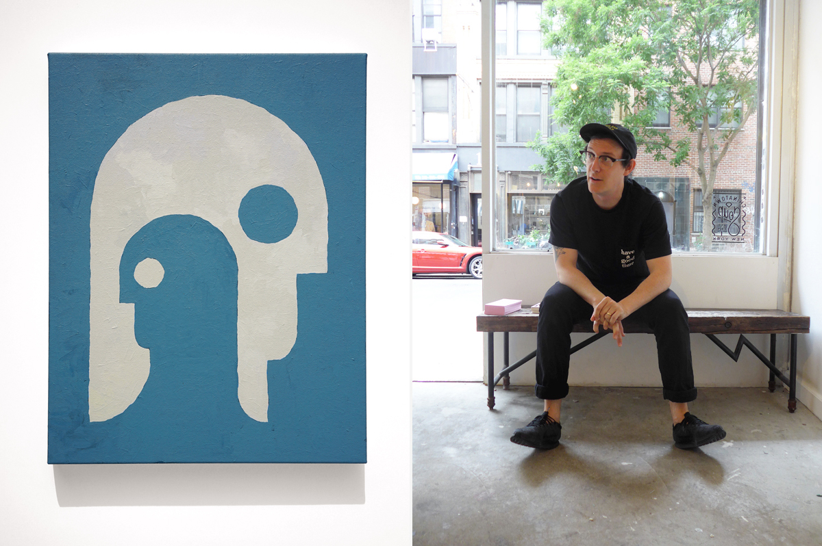 His design days aren’t too far behind him, and that pragmatic part of his mind is still applied to his art. Because of that design-leaning mind, he grids out his canvasses “into thirds, sixths, and sometimes ninths, and occasionally [I] add in a logarithmic spiral like the golden ratio in there. Then I build the painting on top of that underlying structure.” His painting style certainly reflects this mind-set, but avoids becoming too ridged or stark—rather they are warm, playful, yet somewhat earnestly neat.