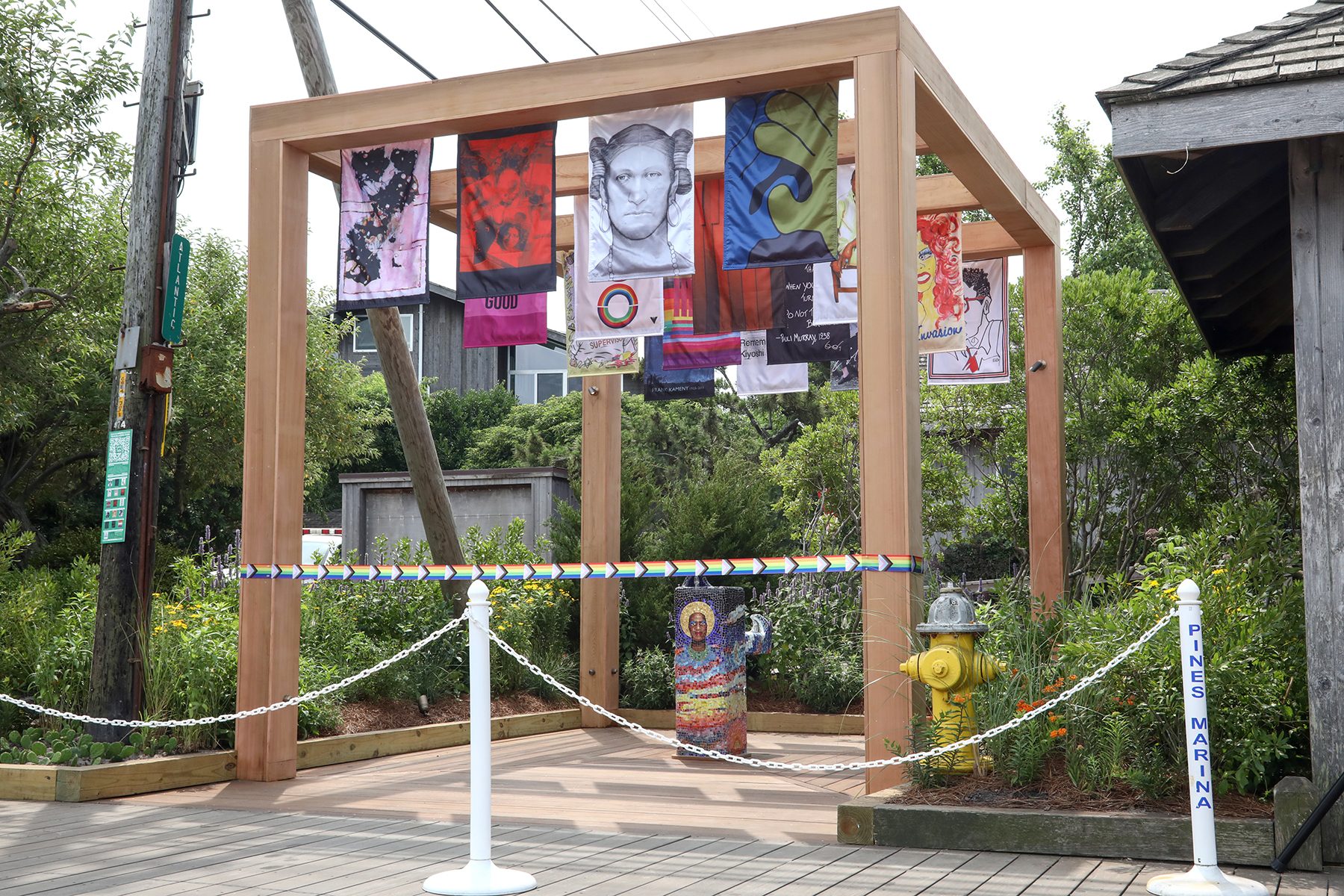 “This community of artists has blossomed in the last decade thanks to the BOFFO residency,” he adds, “which has invited many excellent Black artists, trans artists and queer artists of color to feel belonging and love on this island. I dreamt of what now waves toward the ferry as it enters the harbor, a canopy of banner flags, each celebrating the love of one Pines artist for an LGBTQIA2s+ ancestor whose life opened the gates of our collective liberation.”