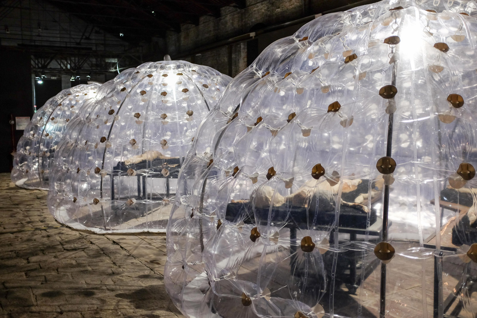 Another surprise at the Biennale is the constant presence of textiles. They’re everywhere, in the form of embroidered sculptures, large-scale installations, knitted dolls and painted dresses. The greatest concentration is at Arsenale, where Ernesto Neto presents a gigantic knitted biomorphic architecture, Cynthia Gutierrez intersects marble elements with “telar de cintura” from the Mexican Oaxaca province, Franz Erhard Walther (this year’s Golden Lion winner for Best Artist) hangs his noted sculptural textile geometries on the walls. Softness and colors are also found in the highly-Instagrammed roundness of “Escalade Beyond Chromatic Land” by Sheila Hicks. In such a small area guests travel from Brazil to Mexico, Germany to the US and event further away, imagining—literally—a common thread that connects the life of the artists.