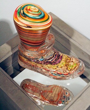 Arranged horizontally or in a dizzying cubistic patchwork, Haroshi‘s laminated skateboard sculptures have rightfully earned the self-taught artist plenty of hype across both the art and skate communities. His latest exhibition, “Virtual Reality,” magnifies his relentless penchant for cross-pollinating passions with a new crop of colorful works which fully reveal his distinct hybrid aesthetic.